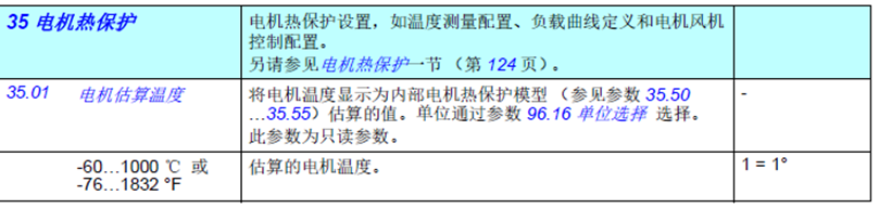有關(guān)全部35組電機(jī)過溫保護(hù)監(jiān)控參數(shù)請參照ACS580固件手冊,這里不再詳述。