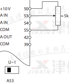 12、27短接,50、53、55接電位器,其中53為電位器中間抽頭,接線前確認控制卡上(面板拿下來右下角)53撥位開關(guān)是否在U端,設置參數(shù)3-15改為1、6-10端子53低電壓、6-11端子53高電壓、6-14 53參考反饋低、6-15 53參考反饋高。